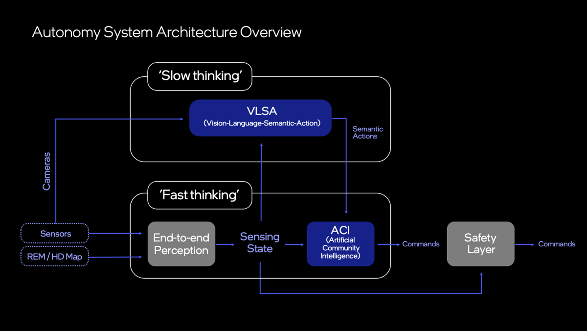 Shashua教授阐述了Mobileye针对这些限制设计的架构方案,以及如何通过“快思考与慢思考”决策双系统、视觉-语言-语义-动作(VLSA)融合模型等创新,在算力和功耗受限的实时系统中,充分发挥现代人工智能的优势,同时保持极高的决策准确性。