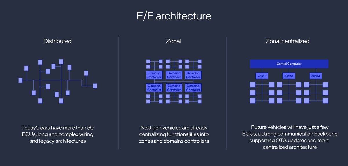 数十年来,车辆一直依赖多家供应商提供的分布式电子控制单元(ECU),一辆车往往配备上百个独立 ECU,各自承担特定功能。这种架构不仅成本高、结构复杂,而且难以实现高效的软件更新。为应对日益增长的系统复杂度,行业正通过架构整合,将数量更少、性能更强的域控制器作为核心,并通过高带宽网关实现跨域功能的协同与互联。